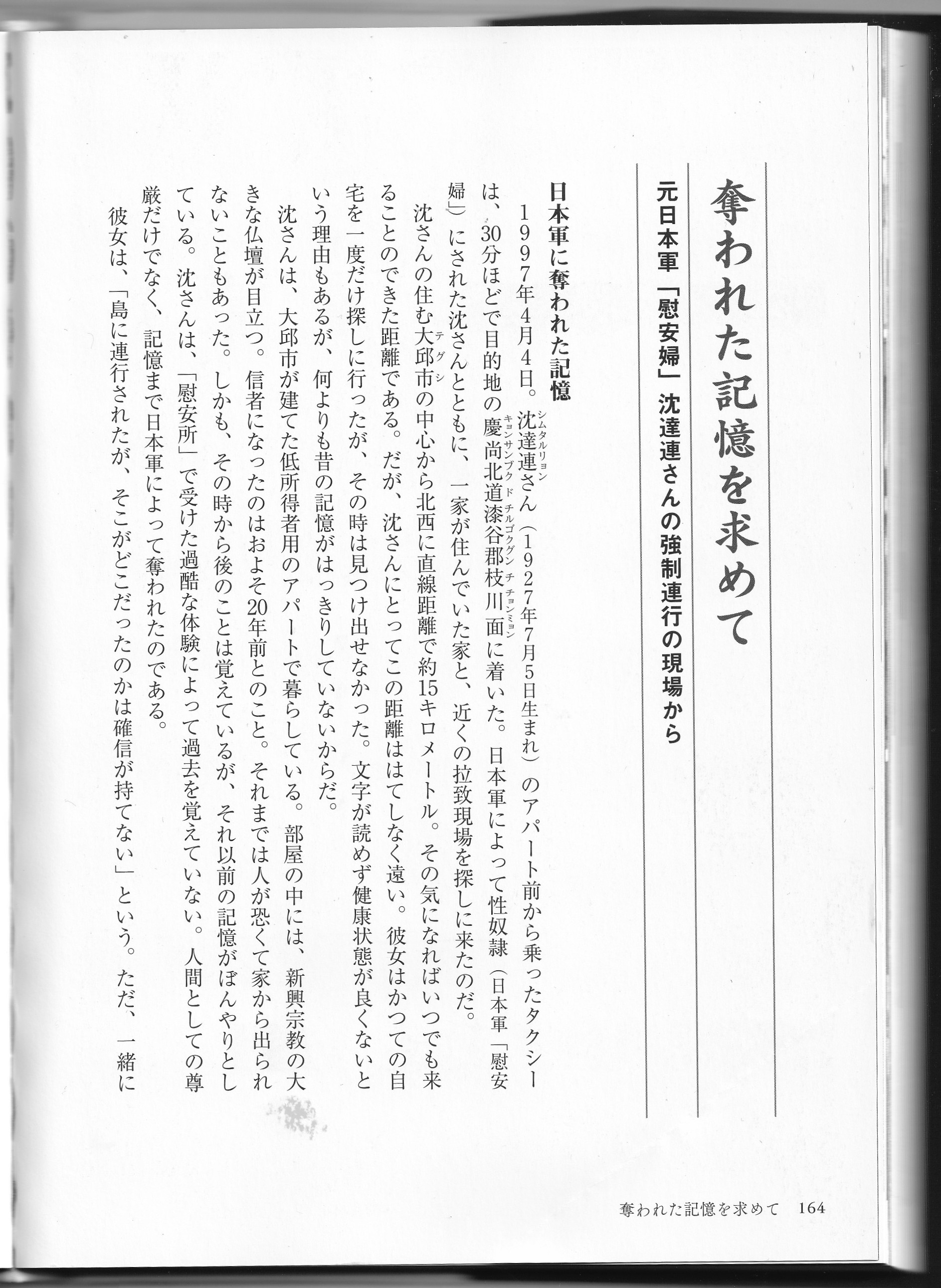 (証言)伊藤孝司さんの著書によると、シム・ダリョン(沈達連、シム・タルリョンとも表記)さんは、慰安所で受けた過酷な体験で過去をほとんど覚えていなかった。伊藤さんは、まず彼女の家族とともに、連行された当時の自宅探しを始め、ついに自宅や強制連行された現場まで発見していく。(続く)