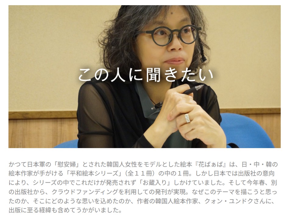 (承前)ちなみに、クォン・ユンドクさんの作品『花ばぁば』は、日本での出版が難航した。上記のインタビュー記事に詳しい。モデルの被害者はシム・ダリョンさん。戦中に植民地・朝鮮で、吉田証言のように、無理矢理トラックに乗せられて「慰安婦」にされた。(続く)